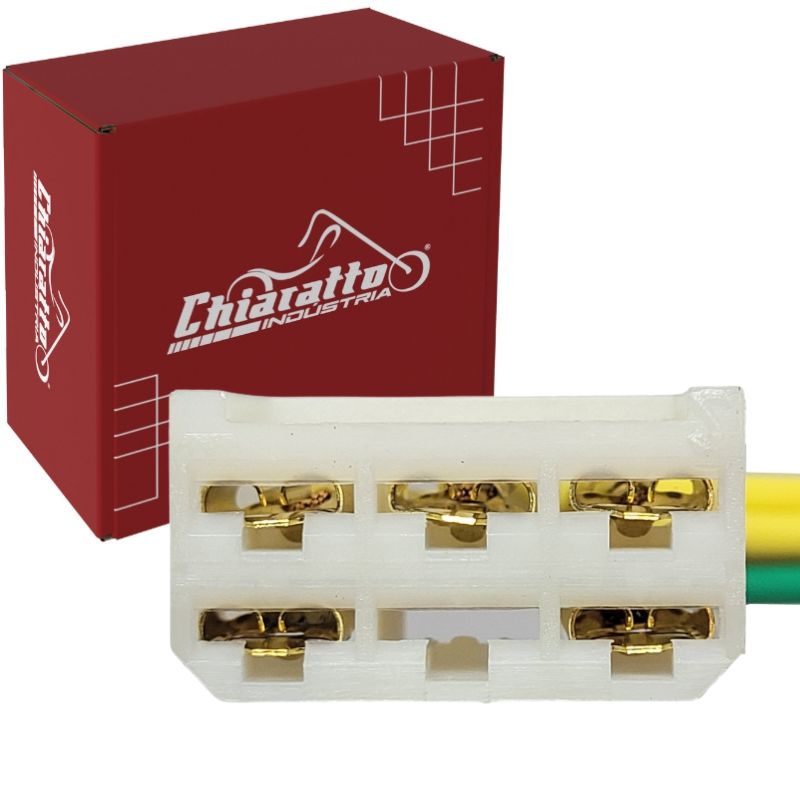 01x Conector de 6 vias com 3 fios amarelos, 1 fio vermelho e 1 fio verde.